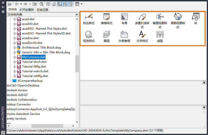 假定您要从更新后的公司样板输入一些标注、文字和表格样式。这些样式在您启动图形后已添加到样板中,因此它们不会从样板中引入。在本示例中,我们将使用设计中心来输入一些样式。