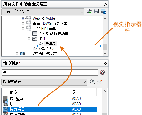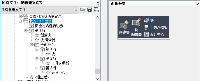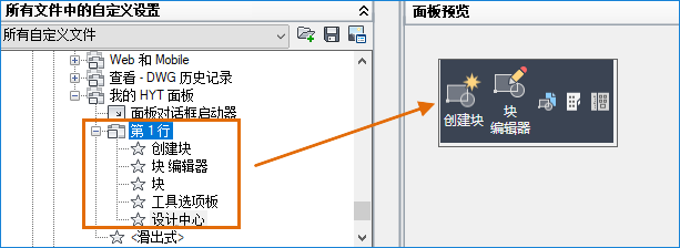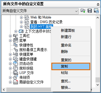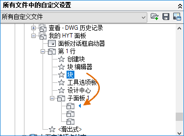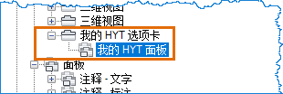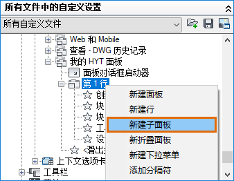 - 在 CUI 编辑器中,找到新创建的功能区面板(“我的 HYT 面板”)(如果需要)。
