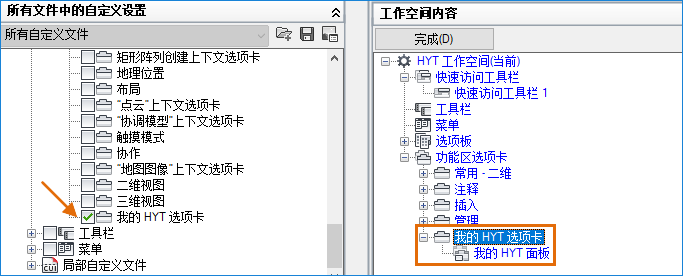 “我的 HYT 选项卡”将添加到“工作空间内容”窗格中的“功能区选项卡”节点。