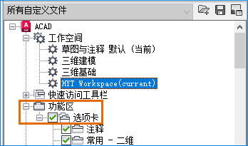 新的功能区选项卡不会自动添加到工作空间中。 以下步骤介绍了如何将“我的 HYT 选项卡”添加到当前工作空间。