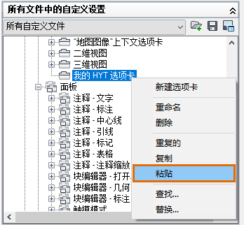 - 在“选项卡”节点下,在“我的 HYT 选项卡”上单击鼠标右键,然后选择“粘贴”。