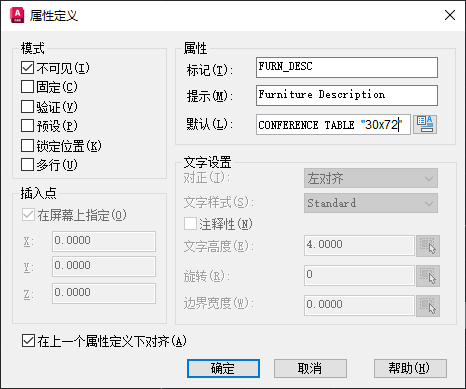 - 再次启动 ATTDEF 命令以创建第二个属性定义,并指定以下图像中显示的值:
