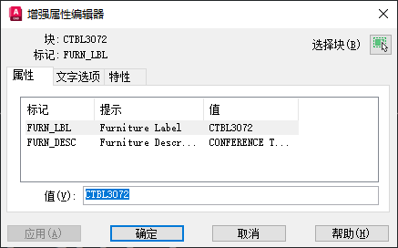 - 接受提供的值并指定属性的插入点,最佳位置是在用于定义会议桌的几何图形内部。
