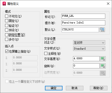 - 标记 - 在属性添加到块之前图形窗口中显示的可见占位符文字;所提供的值用于在从块中提取值时标识属性。