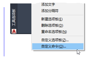 - 在显示“工具选项板”窗口后,在其标题栏或工具附近空白区域上单击鼠标右键,然后选择“自定义命令”。
