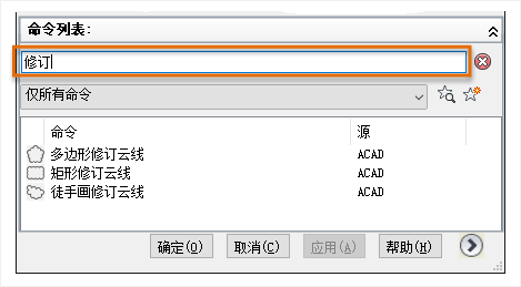 - 在“自定义用户界面 (CUI) 编辑器”的“命令列表”窗格下,单击“搜索命令列表”文本框,然后键入“revision”。