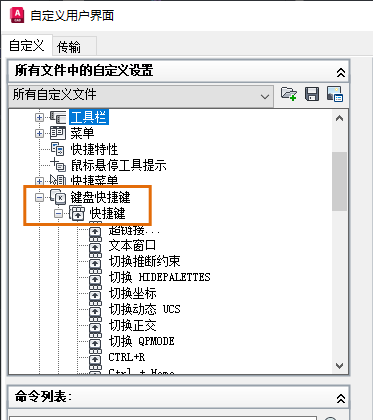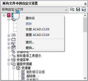 - 在“所有文件中的自定义设置”窗格中的 ACAD 节点(AutoCAD LT 中为 ACADLT 节点)上单击鼠标右键。