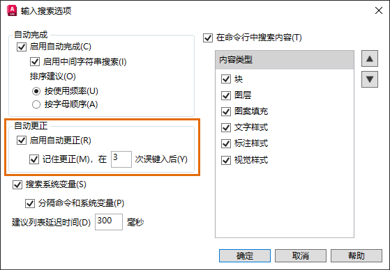如果经常拼错某些命令,建议您尝试“自动更正”功能。在“自动更正”功能启用后,命令行建议列表会根据您过去的拼写错误提供建议。也可以手动将命令和系统变量添加到您经常拼错的“自动更正”列表中。