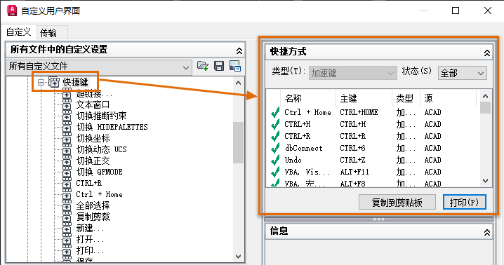 快捷键。启动命令的组合键。例如,“Ctrl+S”保存文件,“Ctrl+1”打开“特性”选项板。功能键(F1、F2 等)也是快捷键。在自定义 (CUIx) 文件中定义快捷键。