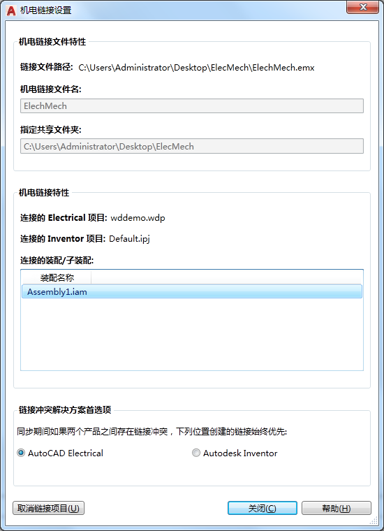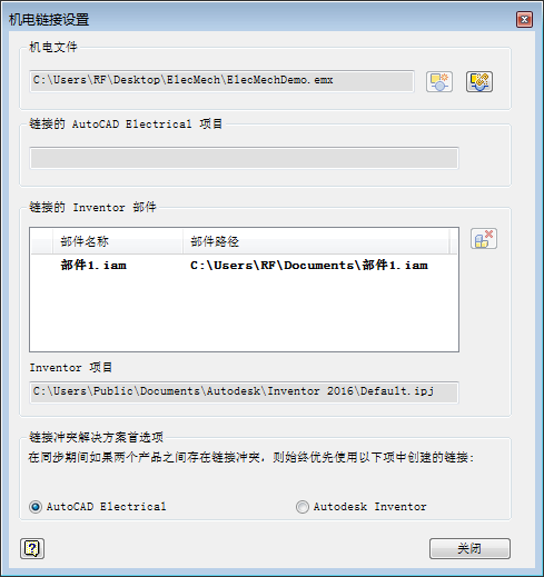 在 Inventor 中创建机电项目,然后通过连接到 AutoCAD Electrical toolset 中的链接文件,链接 AutoCAD Electrical toolset 项目。