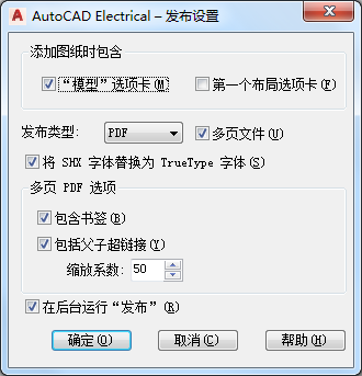 - 在 AutoCAD Electrical toolset 的“发布设置”对话框中,选择 PDF 作为发布类型。
