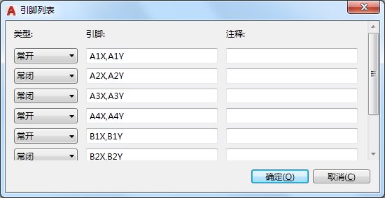 单击以打开“引脚列表”对话框,从中可以定义辅项符号的引脚。