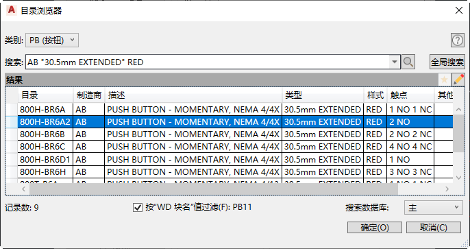 单击“全局搜索”以查找不同种类表格中的特定目录、制造商或装配代号值。例如,“照明按钮”记录在 PB(按钮)和 LT(灯, 指示灯)表格中可能很常见。使用此功能,您可以检查记录是否已存在,以防出现重复条目。