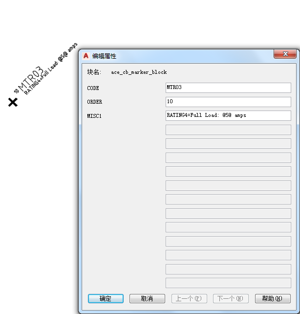 选择电动机回路时,将调用特定电动机设置/注释函数。此特定函数由具有 CODE 值的模板上的标记块标记,该值将映射到 UI_TITLE 字段中标记有“!MCC_CTRL”的回路代号表中的行。此函数将参考 ace_electrical_standards.mdb 文件以确定选定电动机输入参数集的满载电流值和导线尺寸值。