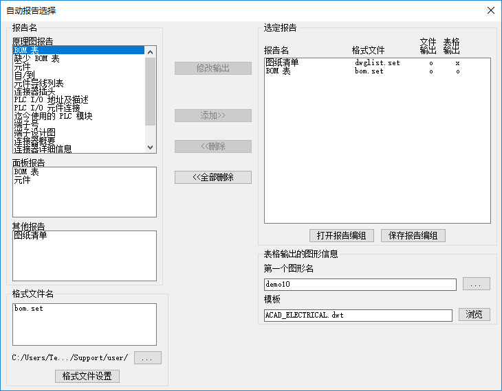 为要运行的每个报告选择报告名称和格式文件 (.set)。格式文件应定义文件输出、表格输出或这两者。
