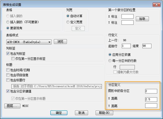 如果“图形中的分区数”为空,则会将报告的所有表格插入到同一图形上。如果为“图形中的分区数”值输入数值,则每次达到该表格分区数时,系统会提示您选择另一个图形。可以在现有图形或新图形中插入表格。新图形将添加到激活项目中。