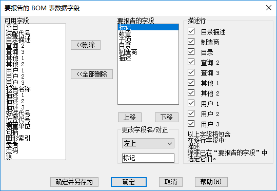 - (仅 BOM 表报告)选择要在多行描述字段中包含的字段。