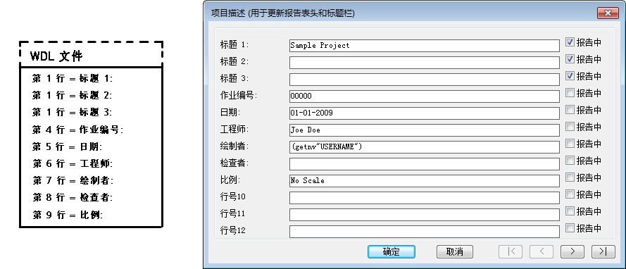 AutoCAD Electrical toolset 中的标题栏和项目描述对话框显示了诸如“LINE1”、“LINE2”等通用标签。您可以更改这些标签,以便它们与指向标题栏的链接相匹配。例如,您已经将 AutoCAD Electrical toolset 数据“LINE10”的值链接到标题栏上的“DRAWN_BY”属性。当 AutoCAD Electrical toolset 显示与标题栏相关的对话框时,您所希望看到的不是“LINE10”,而是“绘制者”。扩展名为 WDL 的文本文件定义了自定义标签。