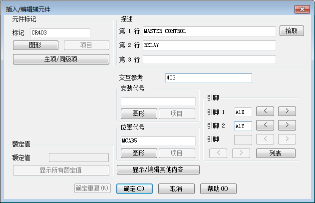 将显示“插入/编辑元件”对话框。请注意,AutoCAD Electrical toolset 没有自动为继电器触点指定标记名称;在编辑框中仅有一个通用“CR”。确定继电器触点标记名称。继电器触点是一个辅元件,必须链接到激活项目的图形中的主继电器线圈。辅项会获取主继电器线圈上的标记名称。
