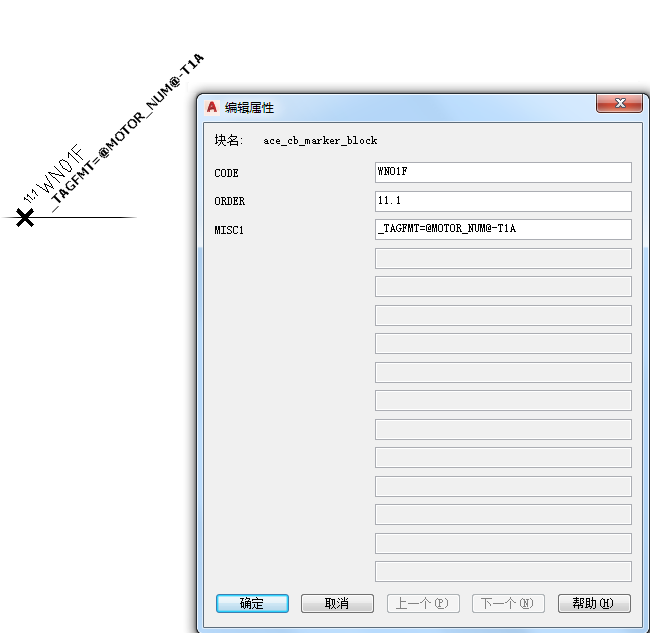 第二个调用 c:ace_cb_save 将电动机上的 TAG1 属性值保存到内存中(索引标记“@MOTOR_NUM@”下)。可以在处理后续线号标记块时参考此值。