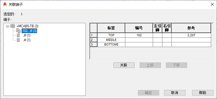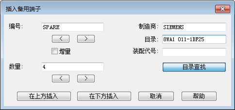 - “目录代号指定”选项卡:除在“端子排”选项卡中可执行的操作外,还可以指定、删除、复制目录零件号,或将其粘贴到端子上。