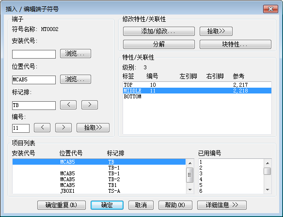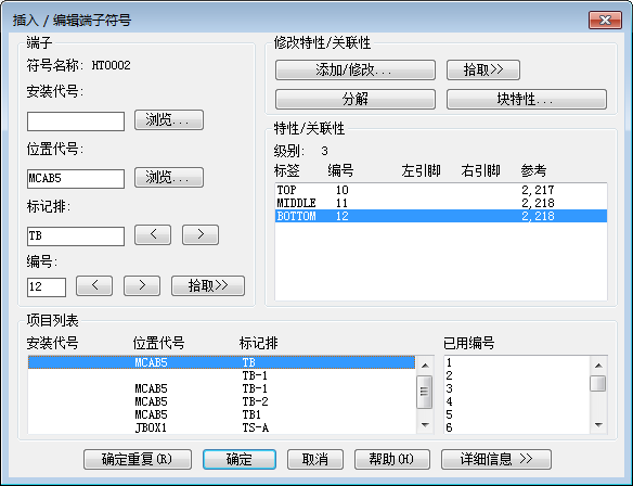 - 在“插入/编辑端子符号”对话框的“项目列表”区域中,选择标记排“TB”。