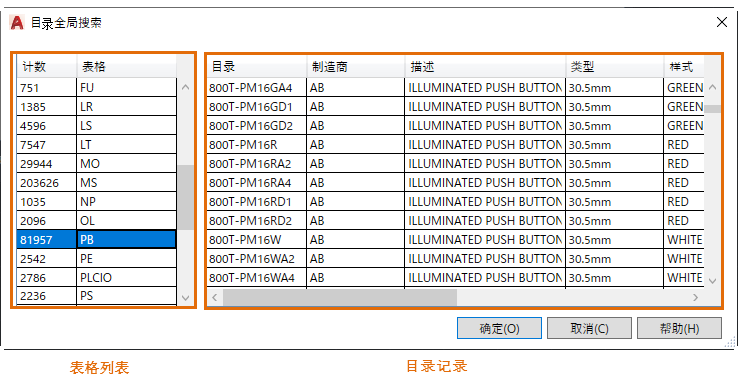 显示选定表格中与搜索值匹配的目录记录。单击列标题以基于该列中的值对记录进行排序。