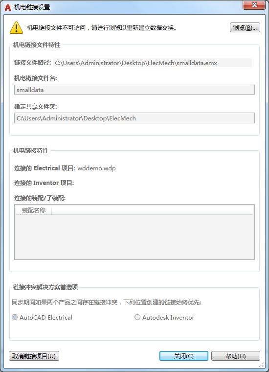 当您将 *.emx 文件移到其他本地或网络驱动器时,将会断开机电链接项目。
