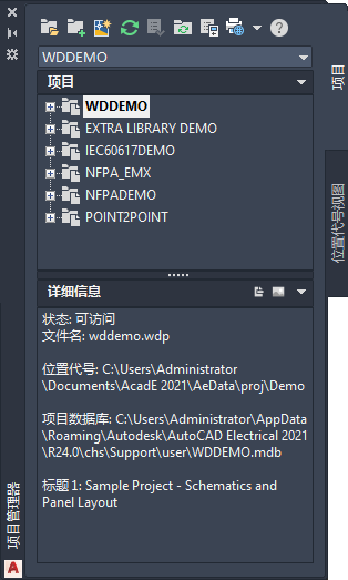 AutoCAD Electrical toolset 是一个基于项目的系统。扩展名为 .wdp 的 ASCII 文本可定义每个项目。此项目文件包含项目信息、默认项目设置、图形特性和图形文件名的列表。您可以拥有任意数量的项目,但每次只能激活一个项目。