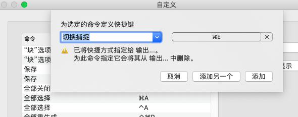 注: 如果已将相应快捷键指定给另一个命令,则会显示一条警告,指明哪个命令已使用该快捷键。