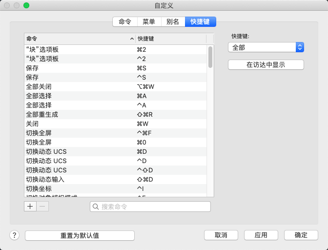 注: 单击“重置为默认值”以删除所有自定义快捷键。