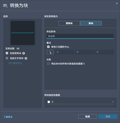 还可以将源对象或选定实例转换为新块。在“转换”对话框中,通过指定块名和插入点来定义新块。默认情况下,插入点设置为选定几何图形的中心。