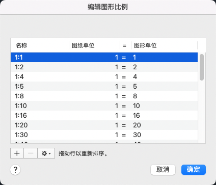 显示当前已定义的比例的列表。当附着外部参照时,也显示输入的临时比例缩放。如果可以复制比例名称,但具有不同的值,则可以在名称中附加数字。