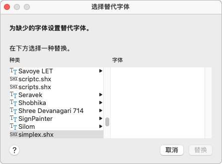 如果未指定替换字体,则在打开含有无法找到的字体的图形时,将显示一个对话框,从中可以为每种缺少的字体指定替换字体。