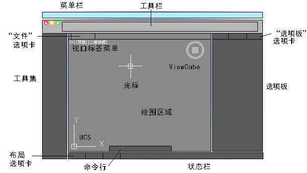 用户界面在绘图区域周围显示选项板和各栏。此外,多个控件也会显示在绘图区域中。