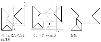 通过首先指定一个基点,然后指定位移点可以拉伸对象。