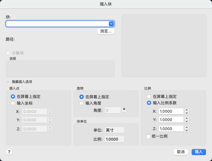 展开或收拢“插入选项”部分,以允许用户为要创建的块参照指定插入点、旋转和比例。