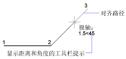 Use PolarSnap™ to snap to specified distances along the polar alignment path. For example, in the following illustration you draw a two-unit line from point 1 to point 2, and then draw a two-unit line to point 3 at a 45-degree angle to the line. If you turn on the 45-degree polar angle increment, an alignment path and tooltip are displayed when your cursor crosses the 0 or 45-degree angle. The alignment path and tooltip disappear when you move the cursor away from the angle.