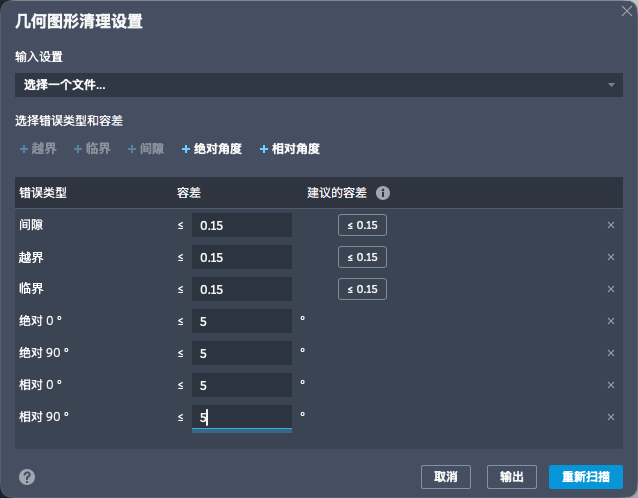 - 在显示的“几何图形清理设置”对话框中,根据需要更新错误类型和公差或用于错误识别的阈值。