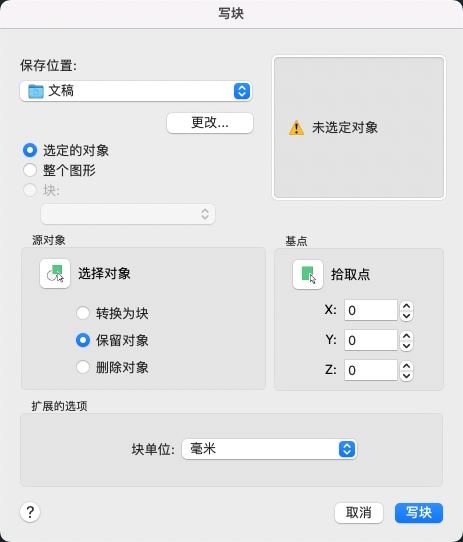 “写块”对话框将根据未选定任何内容、选定单个块还是非块对象,显示不同的默认设置。