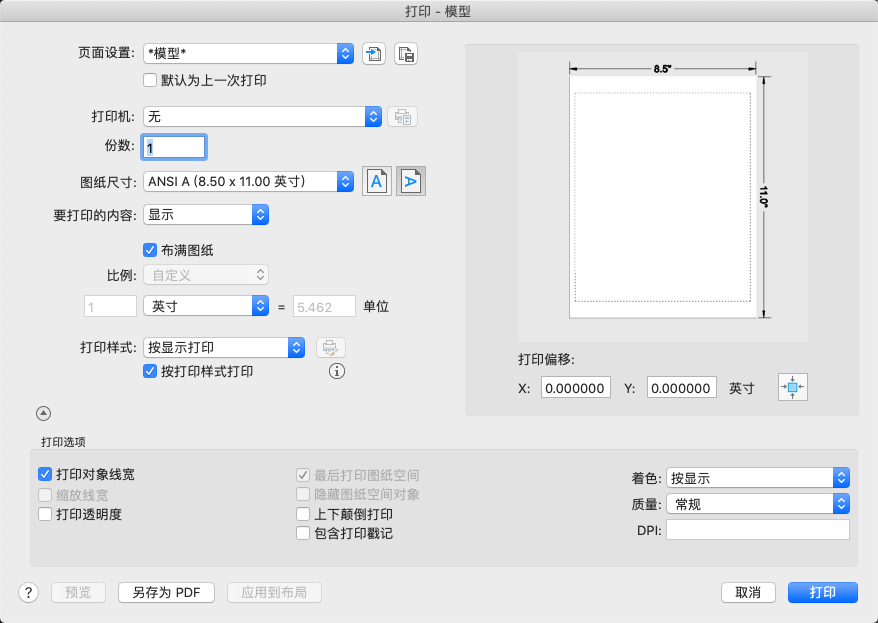 选择图纸尺寸、打印区域、打印比例、方向和其他选项。