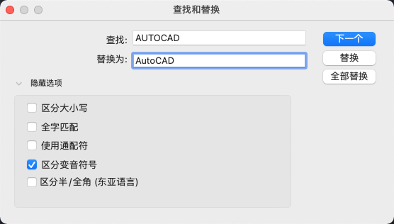 查找下一个与在“查找”中指定的文字匹配的文字,并用“替换为”中的文字替换。