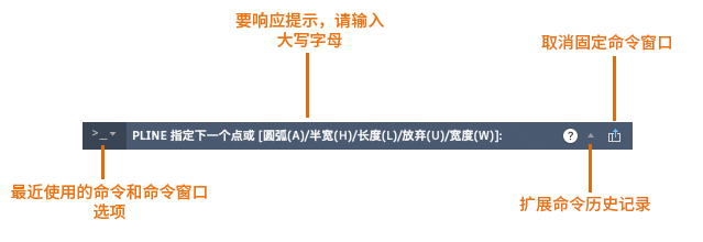 在您输入命令后,您可能会看到显示在命令行中的一系列提示。例如,输入 PLINE 并指定第一个提示后,将显示以下提示: