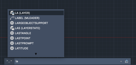 某些命令有缩写名称,或命令别名,您可以在命令行中输入它们。例如,除了通过输入 circle 来启动 CIRCLE 命令之外,还可以键入 c 并按 Enter 键。命令建议列表(如果显示)指明命令名称前面的别名: C (CIRCLE)