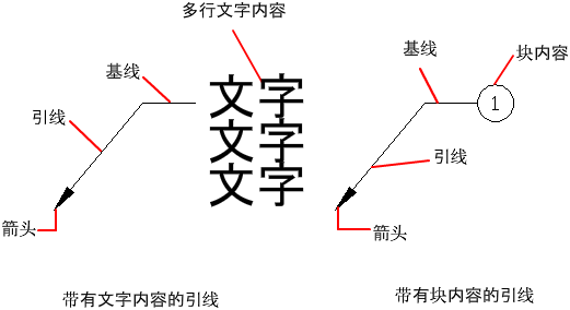 引线对象是一条直线或样条曲线,其中一端带有箭头,另一端带有多行文字对象或块。