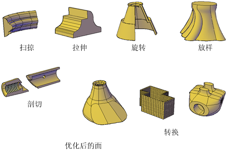可通过对二维几何图形进行拉伸、扫掠、放样和旋转来构造曲面和三维实体。