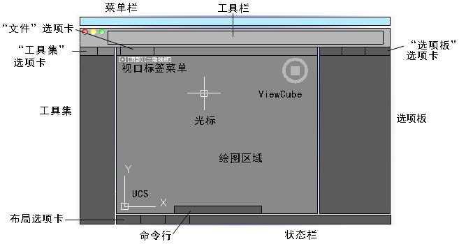 用户界面在绘图区域周围显示选项板和各栏。此外,多个控件也会显示在绘图区域中。