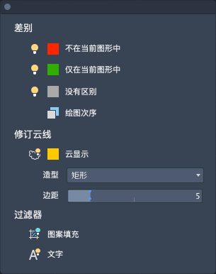 比较图形和当前图形之间的差异将按接近度分组到周围环绕修订云线的更改集中。差异按颜色区分。默认情况下,颜色指定如下: