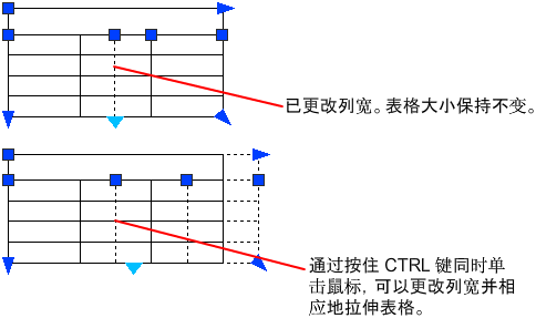 更改表格的高度或宽度时,只有与所选夹点相邻的行或列将会更改。表格的高度或宽度保持不变。要根据正在编辑的行或列的大小按比例更改表格的大小,请在使用列夹点时按 Ctrl 键。