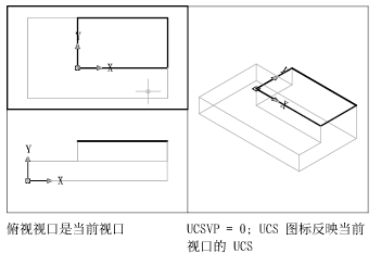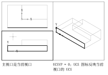 每个视口中的 UCS 都受控于 UCSVP 系统变量。如果某视口中的 UCSVP 设定为 1,则上一次在该视口中使用的 UCS 与视口一起保存,并且在该视口再次成为当前视口时被恢复。如果某视口中的 UCSVP 设定为 0,则该视口的 UCS 始终与当前视口中的 UCS 相同。